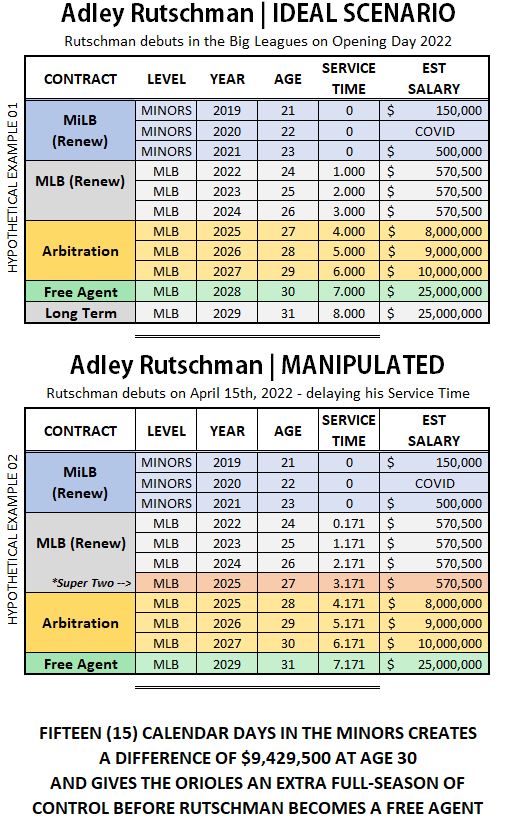 Today, we focus in on the issue of MLB Service Time and how it’s calculated. With both Arbitration and Free Agency eligibility currently riding on it, a Player’s Service Time is a big deal – it essentially determines when a Player gets to “Pass Go” and collect on their big Payday. The biggest complaint of the existing Service Time formula is the fact that it counts days – and when you count days, you leave it prone to manipulation by MLB Front Offices. No matter what the required number of days are to earn one-year of Service Time (currently 172/187 calendar days), that type of limit allows MLB Front Offices to make strategic moves around it, and as we’ve seen in recent history, that hurts the Players. Exhibit A of Service Time manipulation is Kris Bryant, and Exhibit B for today’s study will be Jarred Kelenic. Before getting into the specifics of those two examples, let’s take a look at how this could play out starting today, hypothetically, for one of the game’s hottest prospects: Adley Rutschman.