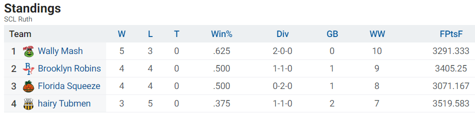 The hairy Tubmen appear at the bottom due to their 3 – 5 record but who leads the Division in Points Scored? (hairy Tubmen have scored the League’s 5th Most Points to date in 2022)