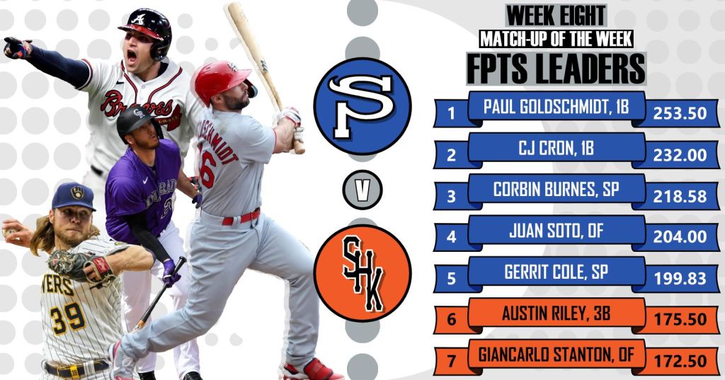 If you total the Fantasy Points scored by all sixteen HumBabe Dynasty League teams in a single week, Week Eight was the highest scoring of the season, and the Say Hey Kids were a big contributor to that. Posting the League 3rd Highest Point Total, 543.42, the Say Hey Kids toppled the undefeated giant of the 2022 Season to this point, the Orlando Splitters (5th best, 487 points). While a little bit of an injury bug has caught up to the Splitter’s mid-season efforts, they were just flat out beat in Week 8. Say Hey hitters managed a combined .280 BA during the week, Orlando .230 BA. On the pitching side, Say Hey’s team ERA came in at 5.18, Orlando’s at 5.96. Say Hey claimed advantages in 12 of the 19 total statistics that count for Fantasy Points, leaving the Splitters with tallies for just Runs Scored, Base on Balls, Strikeouts (Lesser total), Stolen Bases, Strikeouts pitched, Blown Saves (Lesser total), and Holds. From an individual player stand point, Austin Riley was the stand out. Fifty-five point five (55.5) points over thirty-one (31) AB’s included three bombs, eight ribby’s, two doubles and a triple. Don’t let that overshadow the heating-up Phillies in the Say Hey lineup though, J.T. Realmuto and Kyle Schwarber posted 28 points and 47 points respectively, and on the mound Zack Wheeler collected 28.25 points over a 6-innning Quality Start. Notable performances from the Orlando Splitters in Week Eight: Paul Goldschmidt (55), Aaron Ashby (51 over two starts), Corbin Burnes (7.83), and Kevin Gausman (18.83 over two starts).