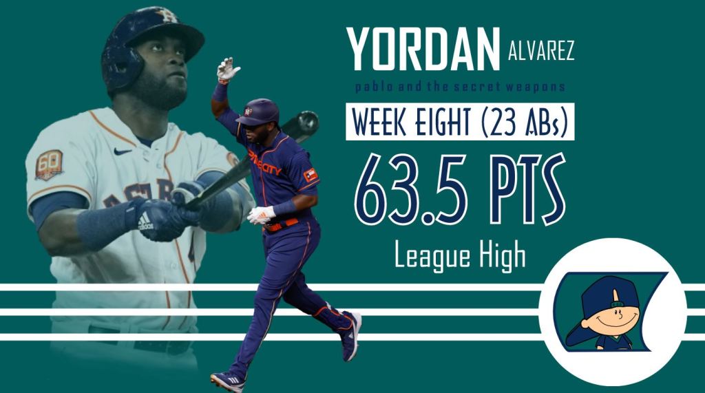 The League’s Highest Scoring Week was lead by Pablo and the Secret Weapons, in a fashion that has their stature not so Secret to the rest of the League. Yordan Alvarez certainly made plenty of noise himself – signed a 6-year extension with the Astros worth $115 Million, and posted a League Best in Week Eight, 63.5 points. And it would appear that Pablo’s Secret of late, is finding Winners in the Free Agency Pool. New additions Trey Mancini (added May 3rd) put up 52.5 points this week, Christopher Morel (Cubs SS) posted 42.5 points, Jhoan Duran (swiped from Orlando) collected 12.5 relief points in three innings, and Rafael Montero (swiped from Wally Mash) collected 12 relief points. Some seem to forget that this team claimed the first ever HumBabe Dynasty Title (2019) and hasn’t faded out of being in the running in the slightest – this secret sauce is something to be weary over come Postseason time 2022.