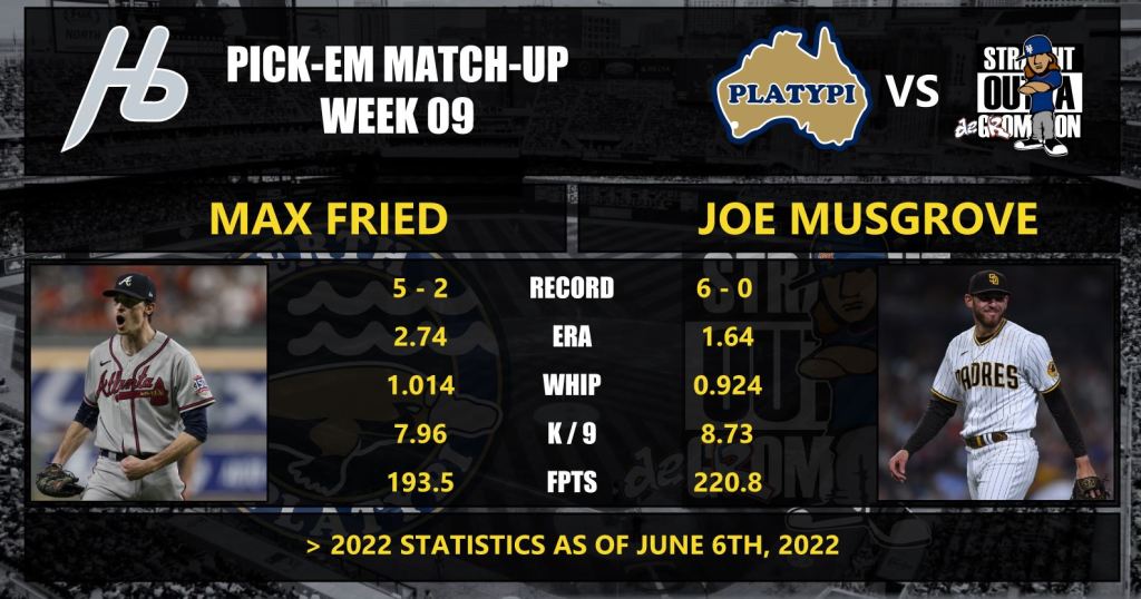 Well, the Artwork for the Week Nine Pick-Em Match-Up couldn’t have been a better comparison. Max Fried, ace of the Perth Platypi, posted 27.5 points in his six innings pitched (0 BB, 1 ER, 8 K’s, QS, W) while Joe Musgrove, ace of Straight Outta deGrompton, matched that with 27.5 points over six innnings pitched (2 BB, 0 ER, 8 K’s, QS, W). Amongst the other arms that threw in this Match-Up, deGrompton claimed the edge by 20 points, highlighted by two-start weeks out of Cal Quantrill and Michael Wacha. But that 20 point separation wasn’t enough to overcome what was lost to the Perth Platypi Hitting advantage. Salvador Perez (36.5 pts) and Cedric Mullins (33.5 pts) led a group of six hitters that produced 30 points or more each for Perth, while Adolis Garcia (38 pts) and Anthony Rizzo (34.5 pts) were the only two that produced the same for deGrompton. The resulting 62 point differential in Hitting Points, and 42 point overall victory moves the Platypi to a BCL Mays Division 3rd Place Standing – 3 W’s and 6 L’s, tied with deGrompton’s record, but with the advantage in Total Points Scored for the tiebreaker.