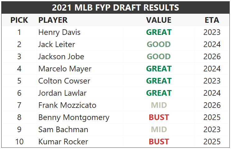 2021 Data makes us feel better about landing a Great prospect, but the jury is still out on most of these players. Henry Davis and Colton Cowser are playing for the Big League Clubs just two seasons after hearing their name called on Draft Day and at first glance, appear to have bright futures – that’s a solid return-on-investment.
