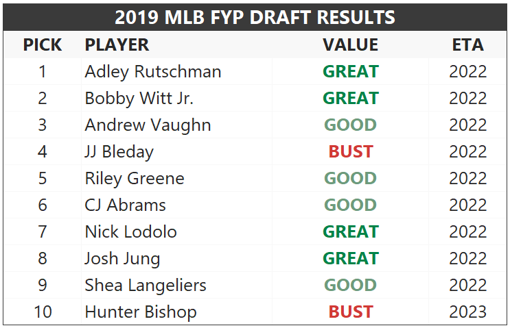 This Draft Class is an outlier, but there’s still knowledge to be gained from it. Littered with Franchise-altering talent (Rutschman, Witt Jr., Jung, etc.) and you still find notable Busts within the first ten picks. Be honest, did you know that JJ Bleday (a Miami Marlins draft pick) is now in the Oakland Athletics’ outfield? A platooned bat in the Athletics lineup with a .182 Career Batting Average is not what we are looking to collect with a FYP Draft Selection, but in 2019, your perception would have been that he was the fourth best available option in the Player Pool.